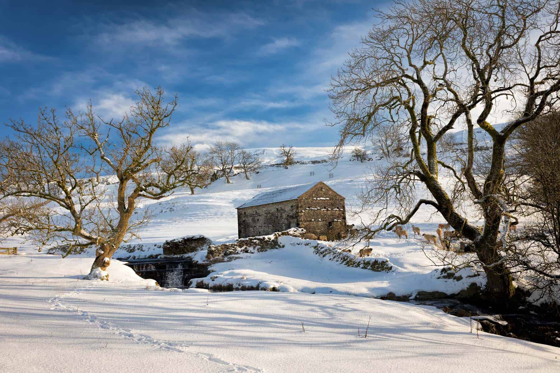 A snow-covered Dales scene with barns and dry stone walls beneath a crisp blue sky — a true winter postcard from Upper Wharfedale.