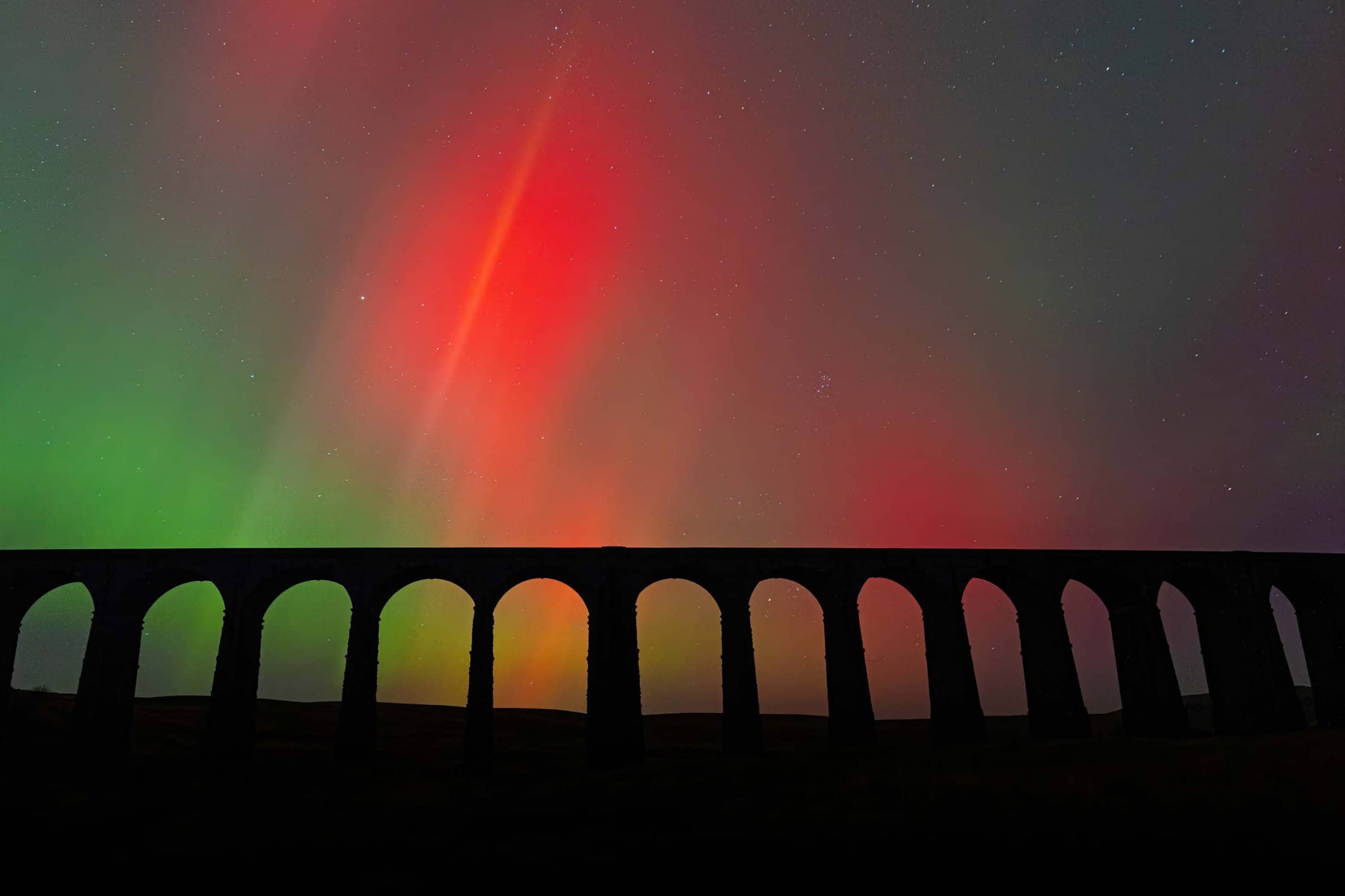A rare and spectacular sight — the Aurora Borealis dancing red above the arches of Ribblehead Viaduct. Shot during an unforgettable October night in the Dales.