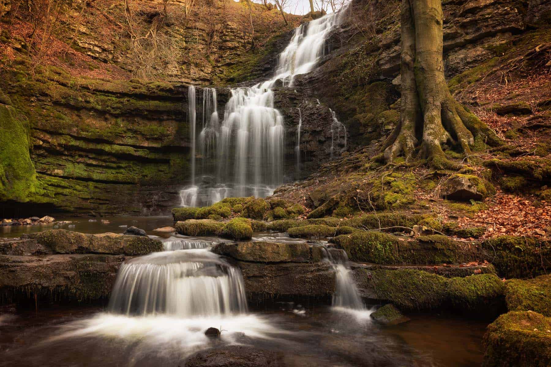 A secret woodland waterfall near Settle, full of atmosphere with autumn leaves and soft water trails captured in long exposure.
