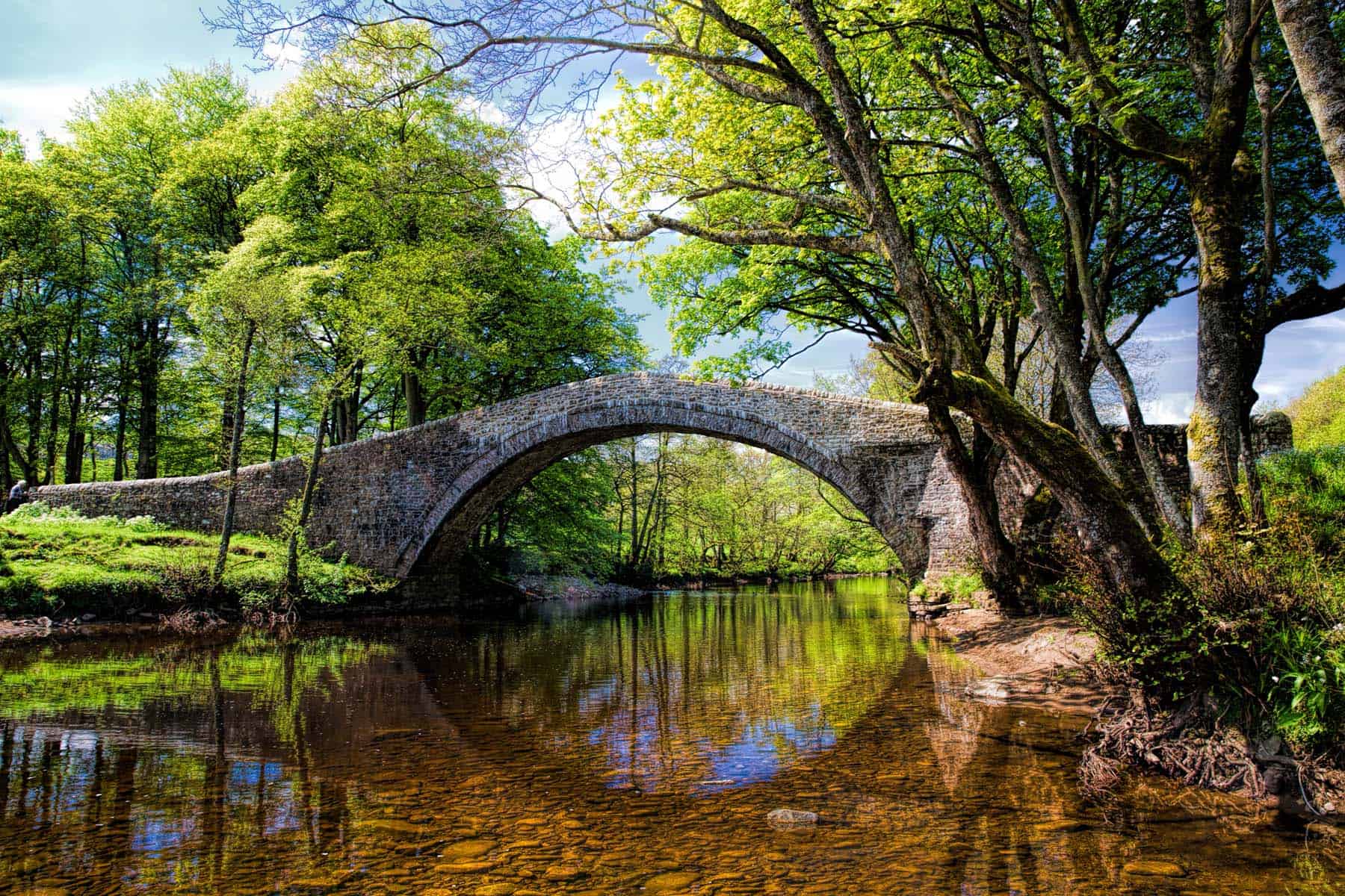 A mossy stone packhorse bridge crosses the River Swale beneath dappled summer leaves — a hidden gem of the Dales.