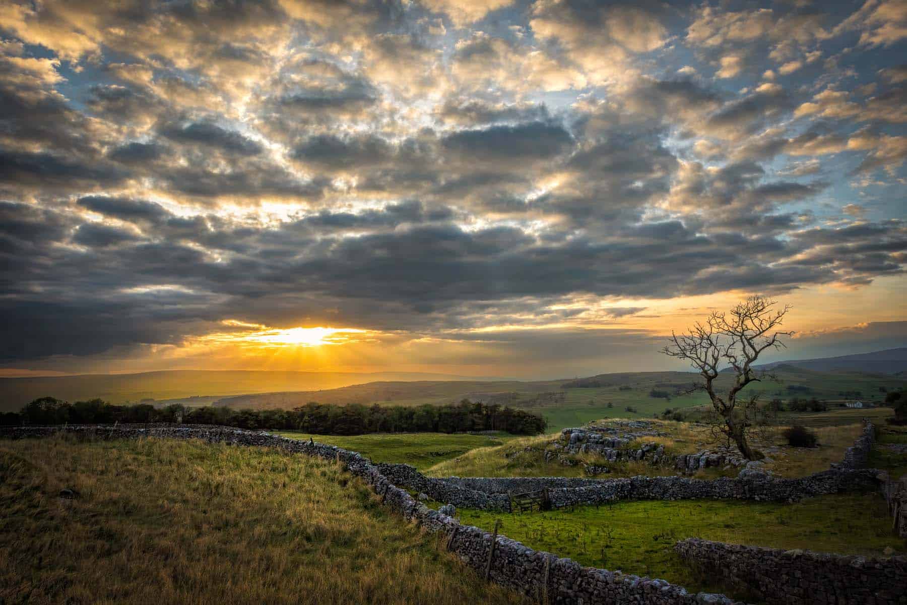 Warm light breaks through the clouds over classic limestone pavement above Settle — a timeless Yorkshire landscape.